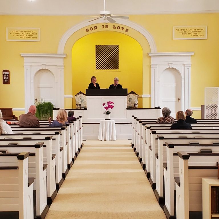 The Christian Science church follows the teachings and practice of our Master, Christ Jesus, and the founder and discoverer of Christian Science, Mary Baker Eddy. We conduct a Sunday service and a Wednesday evening testimony meeting each week.